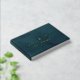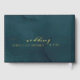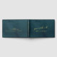 An elegant and sophisticated teal watercolor and gold wedding guestbook featuring gold foil swash calligraphy with your names on the front, spine and back covers in a modern san serif font. The book reads, "guest book,' on the front and wedding on the back in a swash font script with your names and date.