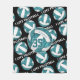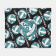 This sporty volleyball team spirit fleece blanket for girls features a large teal and white artsy, stylised volleyball, upon which her name and jersey number can be personalised, overlying a pattern of smaller teal and white volleyballs and the sporty font text "I love volleyball" that stretches between the angled rows of volleyballs - background is customisable black - by katz_d_zynes