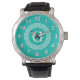 Teal White Greek Key Round Frame Initial Monogram Watch