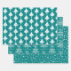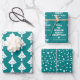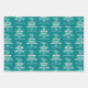 This collection of wrapping paper sheets features a stunning design that combines teal and white colours, resulting in a beautiful and festive look. The first sheet displays an enchanting pattern of white Christmas trees against a teal blue backdrop, adding a touch of sophistication to any gift. The second sheet is uniquely customised with cheerful holiday greetings and the sender's family name, making it a considerate and special addition to any present. Lastly, the third sheet showcases delicate white snowflakes against a vibrant teal shade, evoking a sense of a winter wonderland. By using these sheets, your gifts will be wrapped stylishly and bring happiness to your loved ones.