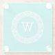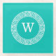 Teal Wht Greek Key Rnd Frame Initial Monogram Glass Coaster