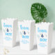 Team boy popcorn boxes for a gender reveal party. Modern design in blue with a stork delivering a baby. Personalise it with the soon-to-be parents' names and the date. A coordinating design in pink with team girl is available in the collection.