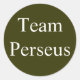 An olive green "Team Perseus" sticker. Perseus was an ancient Greek hero. He was the legendary founder of Mycenae, who killed Medusa (snake hair) and rescued the princess Andromeda from a sea monster before marrying her.