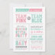 Invite friends and family to find out if your new baby is a boy or a girl with this cute trendy modern baby gender reveal party invitation. The design features a sporty Team Pink or Team Blue theme with a fun bold mix of typography in shades of white, pink and blue. Click the Customise It button to change fonts, colours and move text around to create your own unique one of a kind invitation design.
