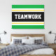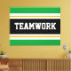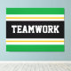 This sporty, athletic design features bold TEAMWORK text inside a highlighted wide black stripe with double white and yellow racing stripes against bright green outer stripes. The text in this design can be personalised.