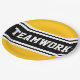 This sporty, athletic design features bold TEAMWORK text inside a highlighted wide black stripe with double white racing stripes against bright yellow outer stripes. The text in this design can be personalised.
