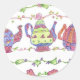 Three bright tea pots in a rainbow of colours accented with rows of flowers and blossoms.