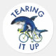 Tearing It Up Blue Shark On Bicycle Motivational Classic Round Sticker