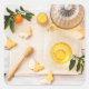 Glass teapot and teacup with green tea, honey, honey spoon, kumquats and cookies with butterfly shape over teatowel ready for teatime.