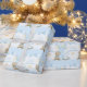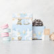 A birthday image with a blue background, featuring a bear with a blue bow around its neck, a white rocking horse with blue dots, and blue and beige balloons