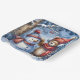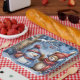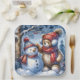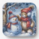 A cosy scene features a teddy bear and a snowman dressed in matching red hats and scarves enjoying a winter wonderland