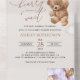 Invite friends and family in style and set the tone for your special day with this charming baby shower invitation. Design features teddy bear with purple balloons on beige background.