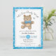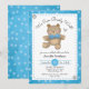 Digitally coloured and hand drawn cute teddy bear artwork baby shower invitation design. Elements painted by Valarie Wade. Perfect for any time on the year. Adjustable text. Blue polka dot teddy bear it's a boy themed baby shower. Classic