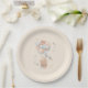 This paper plate features an adorable teddy bear holding balloons. Around the teddy bear there are small stars adding a whimsical and sweet touch.
