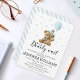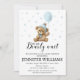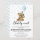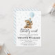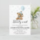 Cute brown teddy bear with blue balloon invitation for baby shower.
