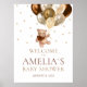 Watercolor Teddy Bear Brown and Gold Balloons Welcome Baby Shower Sign.