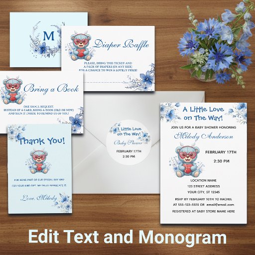 Celebrate your baby shower with this charming blue teddy bear design featuring adorable heart-shaped glasses. Perfect for a baby boy or gender-neutral shower, this sweet illustration adds a playful and modern touch to your party stationery. Customize the front text and add the mom-to-be’s monogram on the back of the card. A soft Valentine-inspired vibe makes it cute for any time of year. Designed by EverSeason Studio.