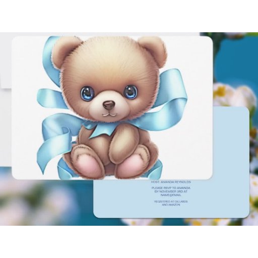 Create a special baby shower enclosure card with your own QR code. Teddy Bear Blue design on the front. Your baby shower details are on the back along with a QR Code that you can use for your RSVP or baby registry. Use the template to personalise.
