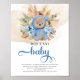 This popular Baby Shower design featured watercolor hand painted cute boy teddy bear in sweatshirt seating in arrangement at tropical dusty blue flowers mixed pampas grass and eucalyptus greenery foliage – all in modern colour scheme – dusty blue, green, brown and beige - makes this set suitable for a boy Baby Shower. The unforgettable sentence " We can bearly wait FOR BABY TO ARRIVE! " - which shows the excitement of parents expecting a baby, makes the design very fun and playful. Used modern calligraphy script font, further strengthens the bohemian look and gives more playful look and make invitation so stunning. The whole charming composition is set on a watercolor pastel ivory background and looks so remarkable. Yes, your guests will be really fascinated - send them this really impressive invitation and surely your boy Baby Shower Party will be remembered for a long time. In this exquisite design we have prepared all the necessary elements for your teddy bear theme for boy Baby Shower Party - such as games, welcome posters, table signs and much more, so you can get a complete set of this exceptional bohemian design with a cute boy teddy bear wearing a sweatshirt with light blue flowers mixed tropical flowers and pampas grass and eucalyptus foliage.