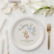 Bear boy baby shower paper plates. Trendy design in blue, brown and beige. Features watercolor cute teddy bear, balloons and script font. Perfect for an elegant boho style shower celebration. Personalize with your own details..
