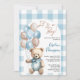 Trendy blue boy baby shower invitation featuring cute teddy bear with blue and brown pastel balloons, "It's a boy" wording and pastel blue plaid pattern in the background. Matching items available.