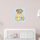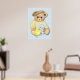 Adorable nursery design with a cute Teddy Bear wearing a Tam. Cute dancing yellow chick and blue toy bunny friends are nearby. Pastel blue plaid background. Would be a sweet addition to a lnursery.