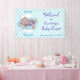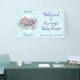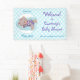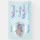 This banner is a great way to greet guests arriving at your baby shower! It features an adorable sleeping little brown teddy bear wearing a purple sleeper with gold stars. The baby bear is sound asleep on a plushy blue blanket. The image is framed in a thin blue line circle, and set against a blue gingham like background. There is a custom text field in darker blue at the top and bottom, and your information is in matching purple and blue at the right.
