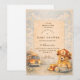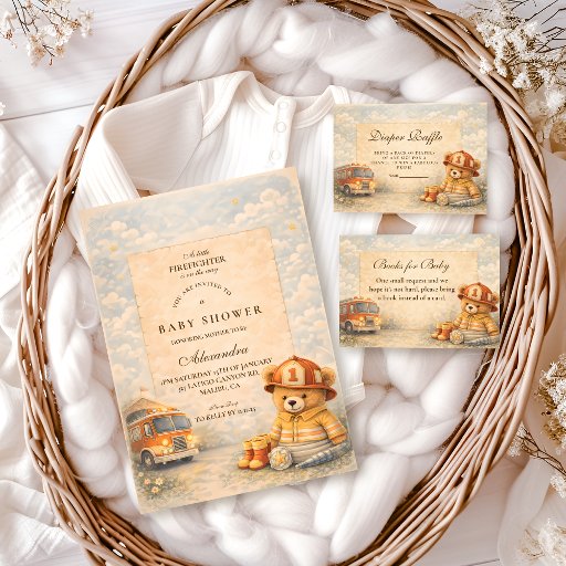 Celebrate a little hero on the way with this cute firefighter baby shower design, illustrated in a warm, storybook style. Featuring classic firefighter details like a helmet, jacket, boots, and fire truck accents, the artwork feels sweet, cozy, and timeless rather than loud or cartoonish.