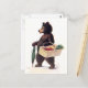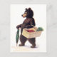 Teddy bear with a basket of apples and a green leafy vegetable under one arm and an umbrella in her paw in a vintage illustration from a 1907 children's book.
