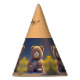 This cute Party Hat features a cuddly teddy bear in the middle of a meadow of flowers against the evening sky. Brown bear, yellow flowers, blue sky. Wonderful Party Hats for baby shower, kids birthday and more! Custom background and text. My idea, generated with AI.