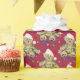 Cute brown teddy bear tangled in Christmas lights on red background with gold stars.