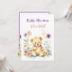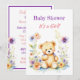 A sweet little teddy bear surrounded by pink and purple flowers watercolor illustration girl's baby shower invitations.