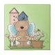 Adorable teddy bear with butterfly wings, surrounded by flowers. A little bee is buzzing by, a flower pot is next to the butterfly bear, which stands in front of a white picket fence that has bird houses behind it.