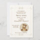 A unisex invitation with a pin stripe background and a delicate frame featuring a teddy bear hugging his toy giraffe. Well-suited for baby showers and birthday parties. Background design by Vecteezy - hollymolly.