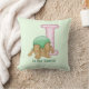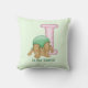 Cute nursery pillow or child's room pillow has soft pastel green background that you can change to another colour if you click the customise button and then look on the right for the small edit link. Front of pillow features an sweet teddy bear bending over playing peek a boo and pastel pink diagonal stripe pattern letter I with text saying I is for Ingrid and is ready for you to change to your child's name.