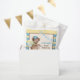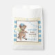 These super cute baby shower favour bags have a striped pattern in yellow and blue with a tan and brown text box. On the left side, there is a brown teddy bear riding a scooter, wearing a blue ball cap turned backward. Three balloons are tied to the handle of the scooter and are yellow, green, and blue. There are also some corner bunting flags in the upper right corner in blue. The customisable text says, "Ashleigh's Baby Shower!" on it in blue and brown lettering with the date also printed in green at the bottom and blue lettering that says, "Thank You!" at the bottom. If you require assistance or would like any other matching items, please email your request to niteowlstudio@gmail.com and watch your spam folder for my reply. Thank you!