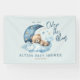 We are Over the Moon Baby Shower banner with cute teddy bear sleeping on puffy blue cloud and the half crescent moon and stars. Sweet boy baby shower decorations.