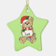 This cute personalised kids' Holiday ornament features a cuddly teddy bear dressed in Christmas red and white. The bear holds a white muffler decorated with holly, and personalised with your child's own name. The image is placed on a light green background. The back of the ornament is matching green, with enough room for your customisation. Easy to change it to say anything you'd like!