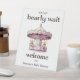 Welcome guests to your twin girl baby shower with this adorable custom pedestal sign! Featuring a sweet watercolor illustration of two cute teddy bears on a charming pink carousel, this sign sets the perfect tone for your celebration. The phrase "we can bearly wait" is displayed in elegantly whimsical typography, adding a playful and heartwarming touch. Easily customisable with your name and baby shower date, this sign is both durable and stylish, making it a beautiful keepsake long after the celebration. Create a magical first impression - order yours today!