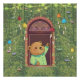 A cute illustration of a teddy bear looking up at colorful wind chimes