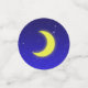 A cute teddy bear holding a gift box is sitting on a cloud in front of a blue night sky with brigh stars and moon.