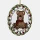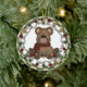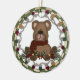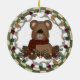 A brown teddy bear with a black and red checked scarf, pine cones, and a set of holiday lights in various colours is featured on a round porcelain keepsake holiday ornament!