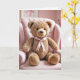 A plush teddy bear with a pink ribbon sits comfortably on a pink upholstered chair in a softly lit room for thinking of you.