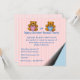 Cute baby gender reveal party invitation done in a pink striped pattern, with graphics of a pealed back right bottom corner, revealing a blue striped pattern. A girl teddy bear and a boy teddy bear, decorates the top of the invitation. Personalise the blue text for your baby gender reveal party.
