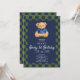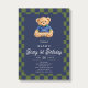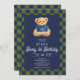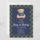 Teddy Beary 1st Birthday Checkboard Blue Green Invitation