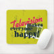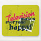 Funny TV retro humour design. Image: Classic 50s TV on a retro shape background. Text: Television makes everyone happy! Retro fifties fonts & colours. Satire social commentary; pop culture.