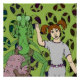A pair of friendly aliens, one looking rather like a praying mantis and the other looking rather like a tentacled blob, seem enthraled by the tales a red-haired human girl tells in this original sci-fi illustration by Richard H. Fay. This work originally appeared on the cover of the April 2015 issue of SPACEPORTS AND SPIDERSILK, published March 2015.