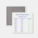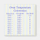 This magent is pretty and useful. It features a background of pastel stripes in colours of yellow, blue, and white. There is a temperature conversion from Fahrenheit to Centigrade to Gas Mark and back again. Perfect for anyone who has a cook book from a different country or someone who has moved to another country!