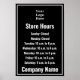 You can replace the display image at the top with your company logo. Under your logo, there's white display text you can edit to write a custom message and your daily business hours for Sunday through Saturday. At the bottom, there's white display text for your company name. The poster is black and has a simple white border. The text is white.