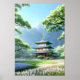 Transport yourself to a world of tranquillity and calm with this stunning digital artwork. A wooden Japanese temple is surrounded by a sea of green grass mixed with delicate white flowers, creating a serene and peaceful atmosphere. In the far background, tall snowy mountains complete the stunning natural setting.